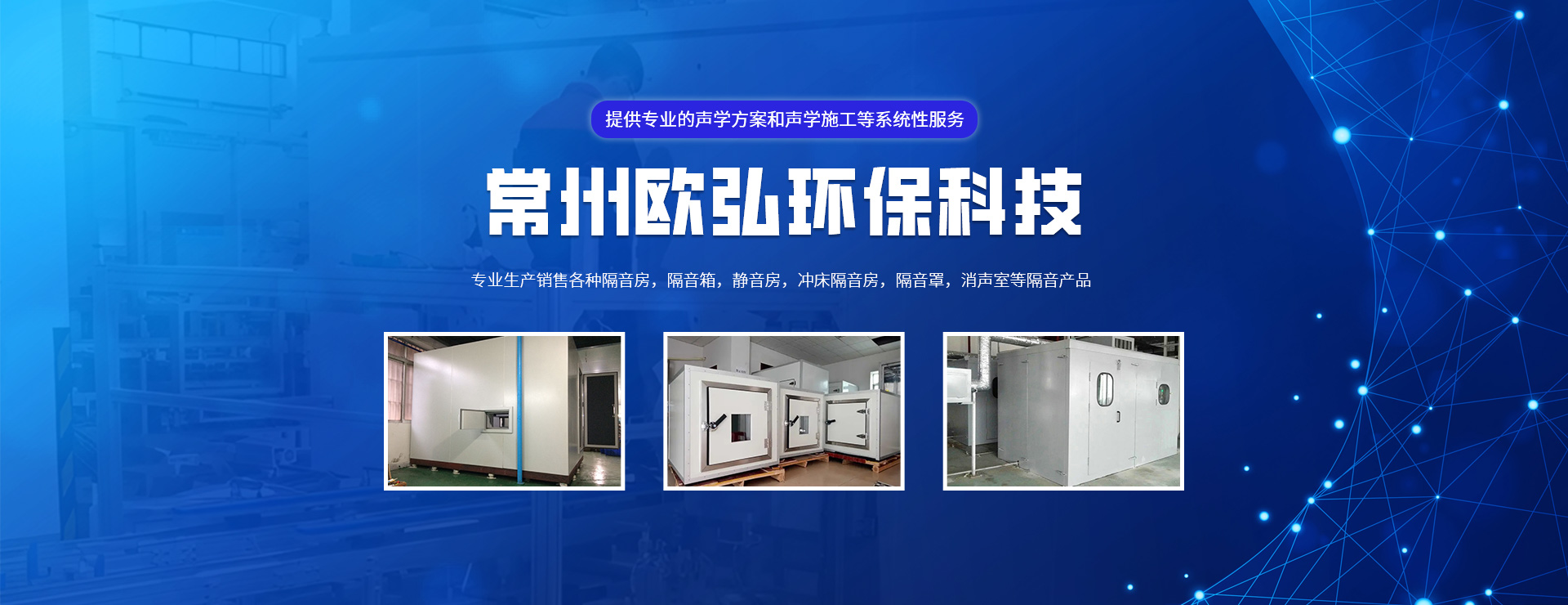 常州歐弘環保科技有限公司是一家專注噪聲治理的企業,公司專注生產銷售各種隔音房,隔音箱,靜音房,沖床隔音房,隔音罩,消聲室等隔音產品。客戶涵蓋汽車、家電、醫療、健身器械等眾多行業。  我公司專注于為客戶提供聲環境深度檢測;聲學方案研究、設計;聲學產品研發、優選;聲學施工與驗收的一整套聲學系統解決方案,是國內成熟的聲學行業系統服務公司。  我們的服務領域:致力于研究并開發高性能、高性價